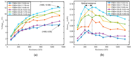 The aerodynamic response and output performance of the harvester are obtained in the above analyses, respectively. The output power of the harvester is still to be further investigated for the sake of determining the optimal resistance, collecting electricity, and considering the future practical application. The harvesters of FSEH-130-0 and FSEH-130-25 were chosen to assess quantitatively the field application testing characteristic and the enhancing performance. Figure 13 shows the variation of root mean square output voltage and power of the harvester with the external load resistance at 10.52, 11.76, and 14.48 m/s.
