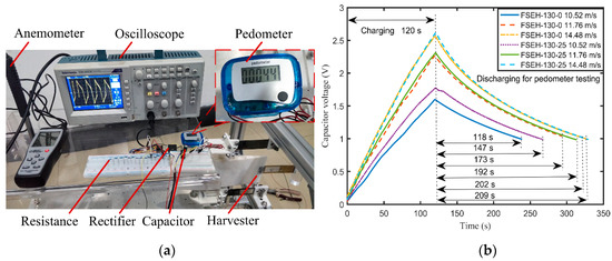 Figure 14a illustrates the experimental device of the energy collecting and storing circuit. An energy collecting and storing circuit includes the resistances, a rectifier (GBU 406), a capacitor (6.3 V, 1000 μF), and a pedometer (initially powered by a 1.5 V cell button battery, capacity of 80 mAh). When the harvester is connected to the circuit, the electricity generated by the harvester can be rectified by the rectifier, stored via the capacitor, and then drive the low-power electronic equipment. The pedometer that exists a suitable application prospect is adopted to estimate quantitatively the output power of the harvesters of FSEH-130-0 and FSEH-130-25. Figure 14b shows the variation of the capacitor voltage with time for the pedometer testing.
