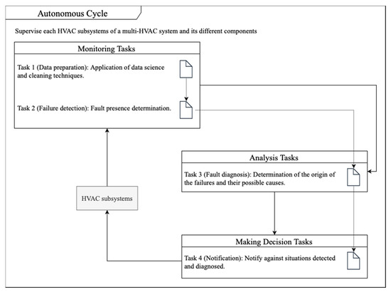 The multi-HVAC model is made of one or several HVAC’ subsystems, formed of coolers and their associated mechanisms, water pumps, electro-valves, etc. The proposed autonomic cycle supervises each subsystem and works with the data obtained by the BMS. ACODAT-based supervision is composed of four data analysis tasks, as shown in Figure 1.
