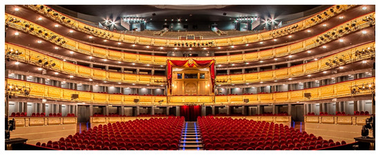 Teatro Real is the opera palace in Madrid, Spain. The total floor square footage in squared meters is 65,000 m2 (700,000 ft2). The theatre has a capacity of 1746 seats. The building has 11 lounges for events, 4 rehearsal rooms, 7 multipurpose studios, an office area surrounding the main theater room occupying several floors and warehouses and technical areas in the basements. Figure 2 is a photo of the theatre’ seats.