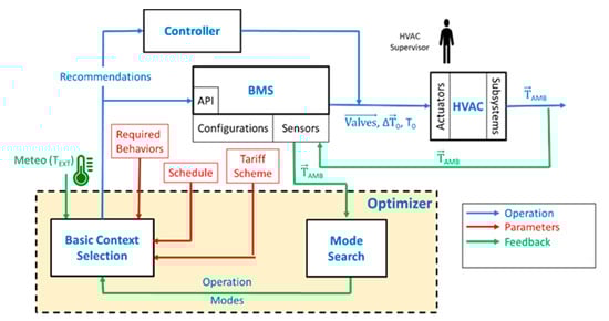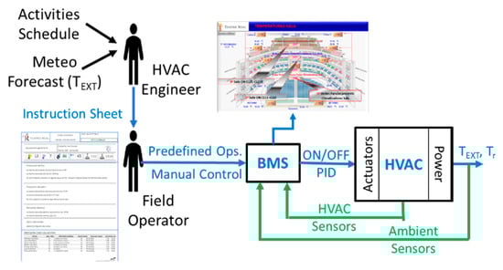Figure 4 shows the ACODAT instantiation in the opera’s HVAC, where the ACODAT tasks embed into the BMS. Particularly, in Figure 4 is shown the BMS, which has our supervision system based on ACODAT. Additionally, there are two other components for the management of the multi-HVAC system. A controller for each HVAC subsystem that regulates its behavior using control loops and the optimizer that determines the ideal configuration of the multi-HVAC system (it determines the level of operation of each HAVC subsystem).