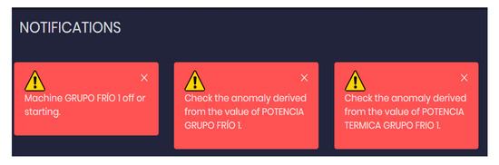 Task 4 notifies detected and diagnosed occurrences from the previous task. It raises alarms or alerts triggered by abnormal-tagged situations in the subsystems, such as an excess of energy consumption, failures, outliers, among other situations. Alarms simply warn about something, while alerts not only warn, but also request further surveillance on something. In the proposed case study, Task 4 raises alarms for any failure, and reports alerts when the subsystems are shutdown.