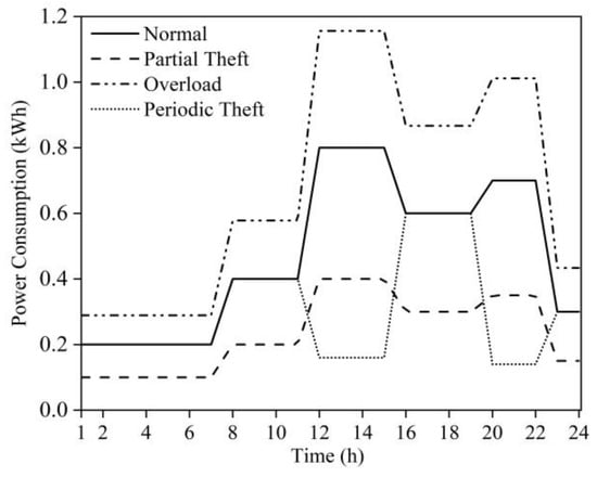 The consumers’ electricity consumption pattern may differ from the legal consumption due to several factors. These factors can be temporary, periodic or permanent consumption changes which are related mainly to the power theft occurrences. For the purposes of the present research three basic power theft scenarios w.r.t legal consumption (Normal) were considered, as it is shown in Figure 2, which are very close to the reality [25]. These are: (a) consumers with smart meter stealing a part of the electricity (Partial theft) of their overall consumption (possibly power pass before the smart meter), (b) consumers with abruptly increased consumption of electricity (Overload), (possible illegal activity or power delivery to a building without legal authorization for power supply), (c) consumers with smart meter stealing a part of the totally supplied electricity (periodic theft) during specific hours of the day, which a high demand of electric power consumption occurs.