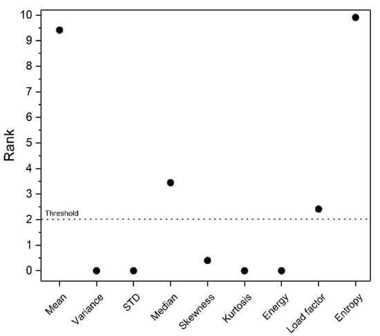 In order to select the appropriate number and type of features which maximize the classification’s process the well-known neighborhood component analysis (NCA) is used [32]. Applying feature selection and computing the ranking importance of features ends up to four top scoring features as inputs, i.e., the mean, the median, the entropy and the load factor of the data, as it is shown in Figure 4.