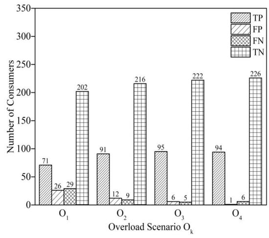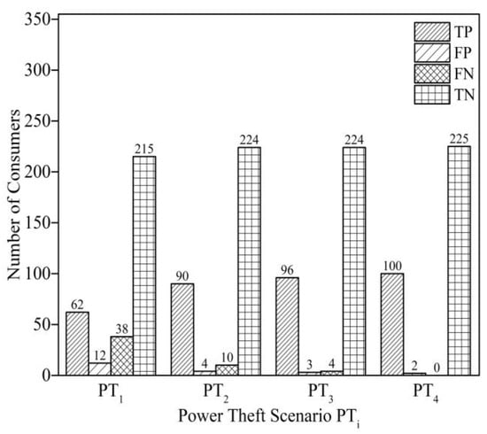 In this section, the performance of the conducted simulations of the thirteen power theft scenarios of Table 1 is discussed in order to assess the robustness of the proposed ANFIS algorithm. In Figure 5, Figure 6 and Figure 7 the worst confusion matrices are shown of the 10-fold validation method applied for each power theft scenario created to evaluate the power theft detection performance of the ANFIS algorithm. The confusion matrices indicated four result types: (a) TP (true positive) is a fraudster consumer correctly classified as fraudster; (b) FN (false negative) is a fraudster consumer incorrectly classified as non-fraudster; (c) FP (false positive) is a consumer non-fraudster incorrectly classified as fraudster; (d) TN (true negative) is a consumer non-fraudster correctly classified as non-fraudster.