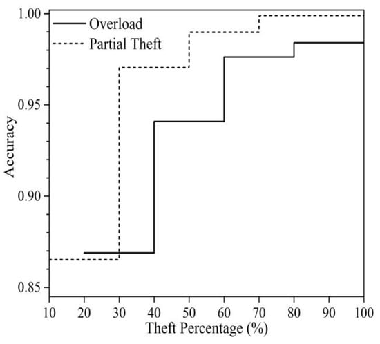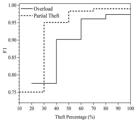 In Figure 8, Figure 9, Figure 10 and Figure 11 the evaluation metrics (accuracy, F1, precision, recall) are shown graphically for the cases of partial power theft of the overall consumption (PTi scenarios of Table 1) and for overload power theft for different power theft percentages (Ok scenarios of Table 1).
