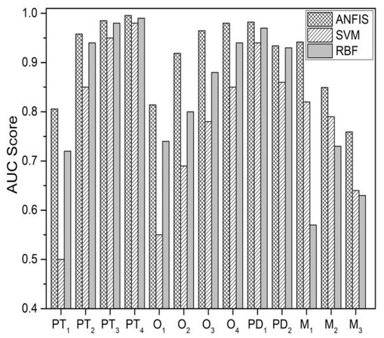 Area under curve (AUC) metric for the ANFIS, radial-basis-function neural network (RBF), support vector machines (SVM) classifiers for all the power theft scenarios of Table 1.