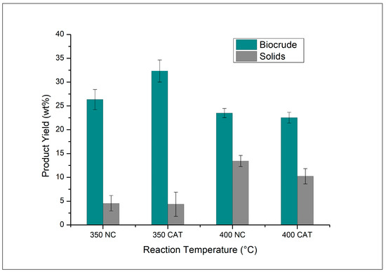 The temperature played an important role and was considered as one of the main factors in the HTL process. The process conditions are reported as 350/400 °C NC/CAT for the non-catalyst and catalyst respectively. The effect of process temperature on product yields is illustrated in Figure 1. It can be observed that temperature has a significant effect on product yield. The maximum biocrude yield was 32.34 wt. % obtained at 350 °C CAT condition and comparatively decreased (23.50 wt. %) with the increasing of temperature at 400 °C. The decreasing of biocrude yield at a higher temperature may be due to thermal cracking of biocrude compounds into gas phase or water-soluble products.