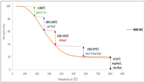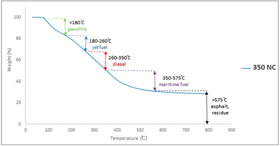 The thermogravimetric (TG) technique was used to evaluate the weight loss during the thermal decomposition of the biocrude. Here only non-catalytic biocrudes 350NC and 400NC were taken for the analysis as demonstrated in Figure 2 and Figure 3, respectively, reflecting the biocrude fractions.