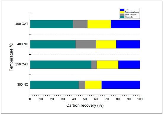 The Carbon Recovery (CR) and Nitrogen recovery (NR) of all product phases from the HTL process were calculated on a dry ash-free basis as shown in Figure 4 and Figure 5 respectively. Based upon the equations mentioned by Shah et al. [19], recoveries in products were calculated. The CR and NR for the aqueous phase were determined by the measurement of TOC and TN respectively.