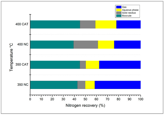 The temperature did not influence on the NR of biocrude and almost the same trend was found at sub/supercritical condition, while addition of catalyst slightly increases the transformation of nitrogen to biocrude. Additionally, in the case of solids, maximum nitrogen recovery was obtained at the non-catalytic supercritical condition, which was about 21.99%. A very small amount of nitrogen was shifted to the aqueous phase in range 5.35–7.19% at subcritical temperature.