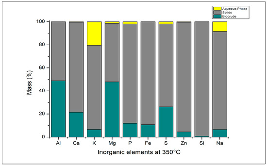At 350 °C catalytic condition, aluminum (Al) and Magnesium (Mg) had approximately the same distribution in biocrude and solids, while a small amount of Mg was also observed in aqueous phase. A different behavior was observed for potassium (K) and sodium (Na), those were getting more occupied in aqueous phase as compared to other detected inorganic elements. This trend of shifting of K and Na to water phase was also observed by Conti et al. [55] for the HTL of wastewater-irrigated willow at supercritical condition.