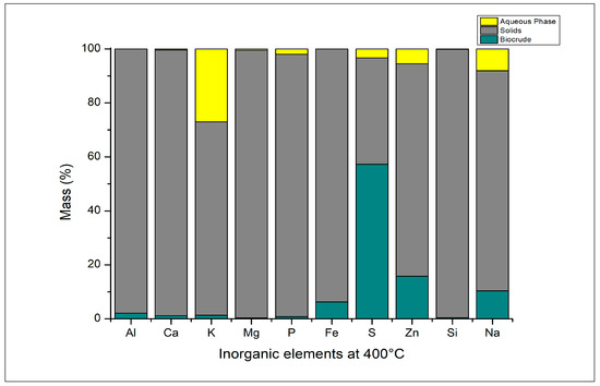 At 400 °C catalytic condition, the trend was different as compared to subcritical condition. Aluminum, calcium, magnesium, phosphorus, and silicon were mostly transferred to a solid residue while the considerable amount of potassium and some amount of sodium and sulfur were transferred into the aqueous phase. One of the possible reasons behind this trend may be a high degree of solubilization of these compounds at the higher temperature (400 °C) and pressure (350 bar) which increase the ionic product of the water, which results in the high concentration of these inorganic compounds into HTL water phase [56]. Furthermore, it was noted that at higher reaction temperature, the total content of heavy metals was accumulated in solid residue, which was also indicated by Huang et al. [57].