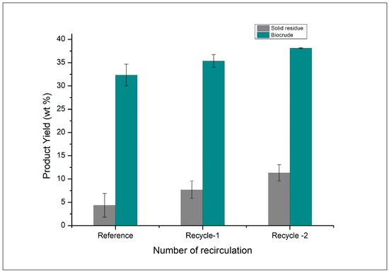 To keep in consideration the continuous HTL plant, aqueous phase was recirculated to analyze the effect of aqueous phase recirculation on product yield, as shown in Figure 8. Additionally, it will also reduce the consumption of fresh water for large-scale continuous plant.