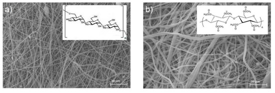 SEM images of electrospun membrane of (a) pullulan and (b) cellulose triacetate with their molecular structures.