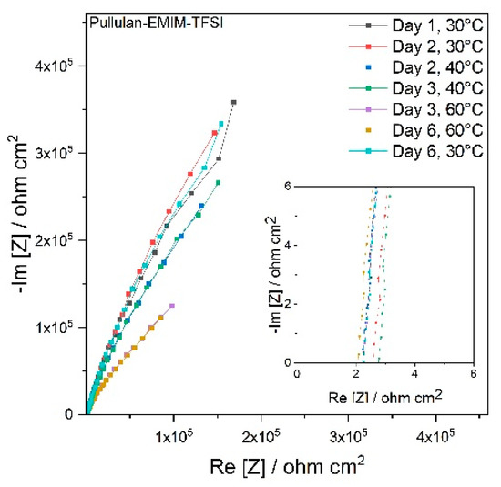 As an example, Figure 2 reports the Nyquist plots of the electrospun pullulan separator in EmimTFSI over time at the different tested temperatures. The Nyquist plots for all the combination of Pu and CTA membranes with the different electrolytes are reported in Figure S2.