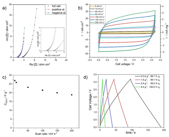 In this section, the results of the electrochemical characterization of the LBHME-EDLCs are reported. Figure 5a shows the Nyquist plots of the LBHME-EDLC single electrodes and full cell.