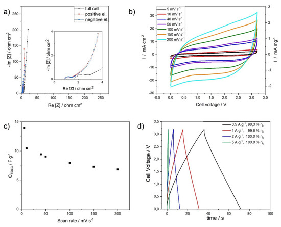 Figure 5b reports the CVs of the full LBHME-EDLC cell at different scan rate, between 0 and 3.2 V. From these measurements, voltammetric specific capacitance values have been calculated and are reported as function of the scan rate in Figure 5c. The highest specific capacitance is 14 F g −1 at 5 mV s−1 and decreases to 7 F g−1 at 200 mV s−1. Therefore, from 5 mV s−1 to 200 mV s−1 there is a 50% specific capacitance reduction, that is higher than what observed for HBLME-EDLC (22%). This can be related to a not optimized electronic and ionic connection of the electrodes carbon particles that has been highlighted by the Nyquist plot analysis reported above (Figure 5a).