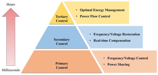 The hierarchical control model is widely applied for the operation of isolated microgrids [38,39]. Traditional hierarchical microgrid control is generally divided into three levels, including primary control, secondary control, and tertiary control as shown in Figure 2 [40]. These three control levels are relatively independent and responsible for their respective functions, but in the meantime, interconnect and coordinate to accomplish the integrated control of the system [41,42].