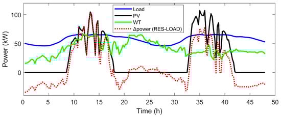 where k is the discrete-time index, and are the generation power of photovoltaic generators and wind turbines; the underline and the overline of power variables denote the lower and upper boundaries of the prediction intervals, respectively. Without loss of generality, only solar and wind are listed here. Other forms of RESs could be defined similarly.