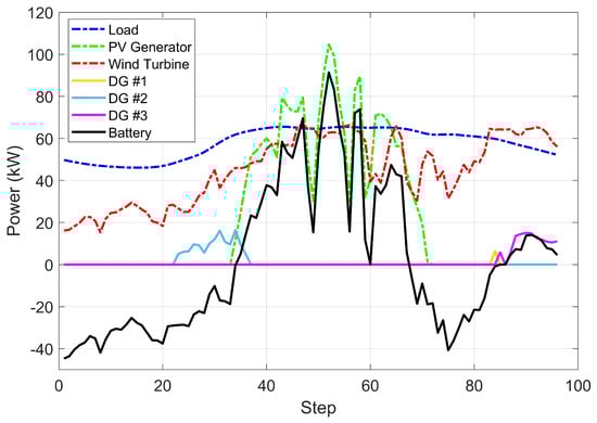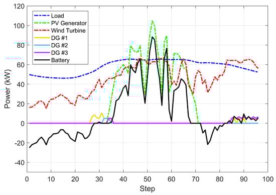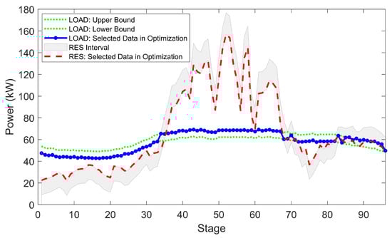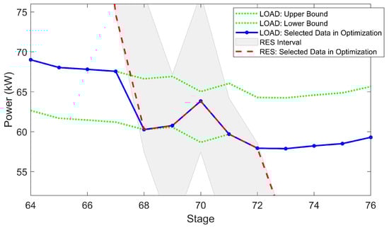 In Figure 11, we integrate the PV and WT generation power and only observe the prediction intervals together with selected values of RESs and load. It can be seen that the system tries to meet the balance between RES generations and load demand so that the cost of extra operation is reduced. When RES generation is high, the optimizer tends to consider the robust situation of load; when RES generation is low, the optimizer is no longer greedy, and it begins to select an appropriate situation of load as the basis for optimization according to the system capacity. This behavior can be seen more clearly in Figure 12 where the area from step 65 to step 75 is zoomed in. It turns out that our method could be explained as a conditional robust method in terms of the behavior of the optimizer, as the optimizer tends to select an extreme scenario based on the capacity of the system. In other words, when the system is in good capability to handle future uncertainty, our proposed method makes the system to prepare for the worst condition; when the system is incapable of handling too much uncertainty, our proposed method allows the system to prepare for a relatively better condition to reduce the cost. It should be noticed that, even though the system is not always preparing for the worst condition, the system stability can still be maintained well due to the fact that there are still energy storage devices and dispatchable generations. This validates the advantages of our proposed method.