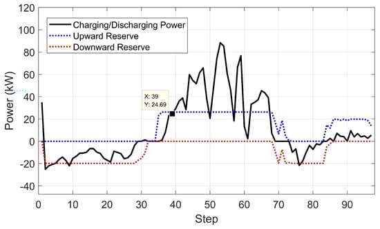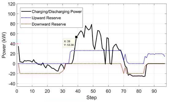 Here, we introduce two reserve variables and to represent upward reserve power for charging and downward reserve power for discharging, and two binary variables, and to indicate the charging or discharging states of batteries with constraint
