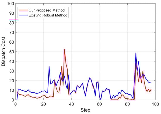 It can also be inferred that, with the given data and simulation setup, our method could achieve the optimal performance when is somewhere around 0.8, and the conclusion is consistent with that of the dispatch with perfect information. It should be noticed that there is no randomness in the optimization with perfect information since the prediction inputs are just the exact actual data. Therefore, the performance curve of the dispatch with perfect information could give some guidance to find the optimal value of parameter , which could be obtained by simply simulating with different only once.