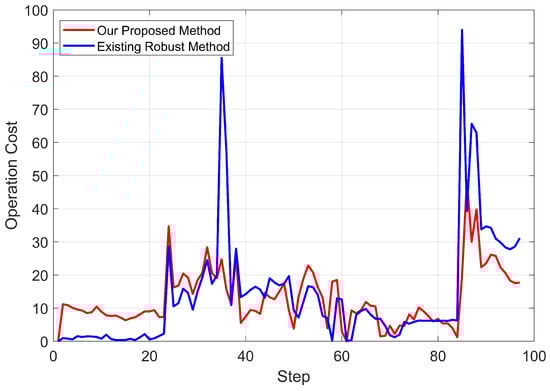 Operation cost of our proposed method, existing robust method, and MPC-based optimization method with different .