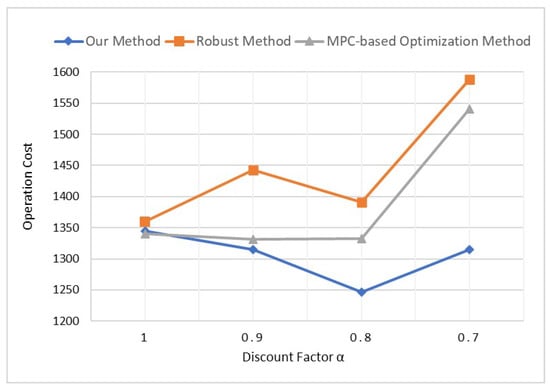 We can see that our method performs excellently around , and the operation cost of the MPC-based optimization method also decreases slightly as goes from 1 to 0.8. When is larger than 0.8, the cost of the perfect information dispatch increases rapidly, and even the smallest cost of our method is larger than the average cost when . This illustrates that, when is large, the system focuses more on the future, making it difficult to achieve lower cost in the operation at present, and when is smaller, the system cares more about the current steps so that it can reduce the operating cost by preparing less for the uncertain future. This property also leads to the violations when is too small (less than 0.7 in our simulations), as the system prepares less in advance and may not able to cope with huge variations especially when the actual situation deviates significantly from the expectations.