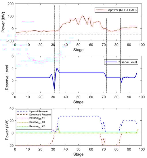 Simulation results related to the reserve strategy. Top: the power differences of RES generation and load demand. Middle: the reserve level over stages. Bottom: the reserve powers in battery and DGs.