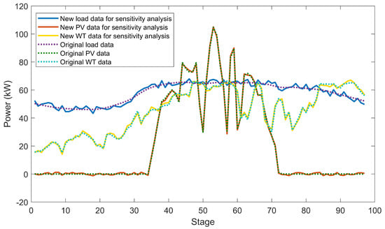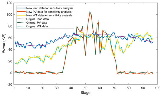The discrete time step is still 15 min. Every single point in the original data sequence is changed by a random variation. Here, we conduct two groups of sensitivity analyses and set the variation level to 5% and 10% of the mean value of the original data. Figure 14 and Figure 15 show the new power data of load, PV generation and WT generation in one of the random cases using 5% and 10% variations, respectively. The solid curves are the new data and the dotted curves are the original data for comparison. It can be observed that the new data have higher volatility.