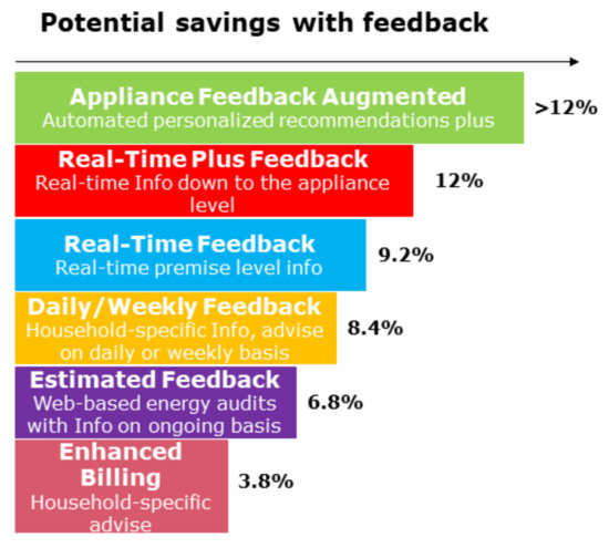 Two of the main global problems that we are currently facing are pollution and consumption control. In the Paris COP (United Nations Climate Change Conference 2015), the United Nations agreed to limit global warming to 1.5 degrees by 2100 and, therefore, reducing energy consumption has become a key task for achieving this goal [1]. The fact that 27% of electricity consumption in Europe is attributed to households emphasizes the need to enact regulations promoting suitable and responsible electricity usage. In this sense, monitoring home energy consumption is an important task in order to optimize and reduce electricity usage [2,3]. Therefore, there will be great benefits if behavioral patterns on appliance usage could be automatically detected with an eye to modifying consumer habits [4], with a potential reduction of 12%, depending on the type of feedback that is provided, as depicted in Figure 1.