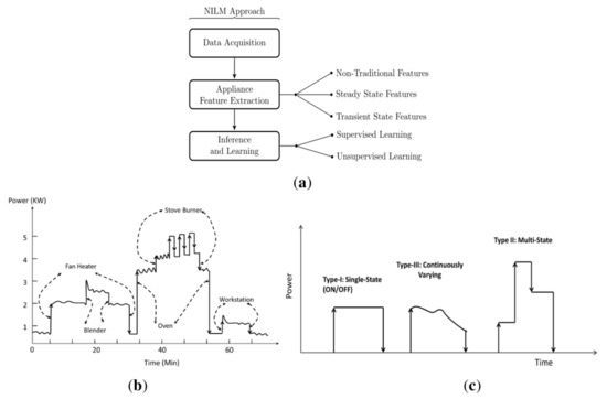 Classification of appliances based on their operation types [14]. (a) General framework of NILM approach (b) An aggregated load data obtained using single point of measurement; (c) Different load types based on their energy consumption pattern.