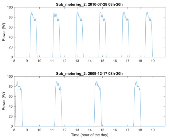 Therefore, appliances, like refrigerators, are very predictable, and modeling by means of a time series model is feasible. There are some differences in the period of the signal, which may depend on the thermostat setting for the room’s temperature, although neither of them changes very often. So, a model that implements some adaptation and forgetting factors could cope with the signal type without any trouble. As an example, Figure 9 shows the power of Sub_metering_2 in two time intervals in which no appliances were operating other than the refrigerator. The first graph corresponds to 28 June 2010—the middle of the summer—and the refrigerator starts with a period of nearly 2 h, while the second graph corresponds to 17 December 2009—winter—and the period is longer than 3 h.