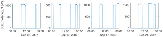 Conversely, the water-heater basically starts when hot water is used in the house. Figure 10 shows the power profile of Sub_metering_3, which includes the water heater, during the four Mondays in the month of September 2007. There is a power step reaching about 1kW every morning, which is probably triggered by using the shower. The exact time of this event is not always the same (7:05 a.m. on 3 September, 6:15 a.m. on 10 September, 7:24 a.m. on 17 September, and 6:29 a.m. on 24 September). In addition, the length of time that the water heater runs was not constant, where the variation is probably due to the amount of water used. These parameters (start time and elapsed time) depend on user behavior and cannot be predicted with time-series analysis techniques. Even when selecting the same day of the week, as in Figure 10, which should be the most similar to each other, the power profiles are completely different.