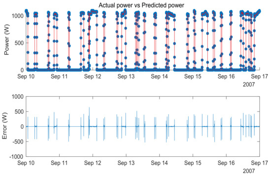 Trees must be pruned to avoid overfitting, to make them more generic, and to yield better overall results. The model developed in this way is very accurate and could clearly detect all 25 water-heater cycles during one week in September 2007 of data analyzing smart meter number 3, in which the air conditioning unit was not available yet. Figure 11 shows the actual power of Sub_metering_3 in blue and the prediction of the model in red. The second graph shows the prediction error, which only has spike values during transients of power.