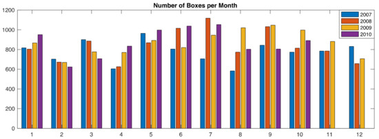 In order to show the effectiveness of the Box Model proposed in this paper, all four years of data of the Paris dataset where analyzed. Figure 13 shows the number of boxes created for every year and every month, which is an indication of the activity in the house, since each change in the consumption level creates a new box. In 2010, the graph does not include November and December because data collection runs until mid-November of that year. In 2007, the last week of July and the first 3 weeks of August there was very little activity because the house owners were probably on vacation; so, even though June through September are the hottest months of the year in Paris and Air Conditioning activity could be expected, the overall activity in 2007 is smaller. In 2008, August was the period of summer vacation and the level of activity was also smaller that in July of September.