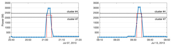 In regard to the fuzzy clustering approach presented in this paper, Figure 15 presents the case of a Kettle event that is not correctly classified with classic clustering. In these graphs, the black dotted lines represent the centroids of the clusters associated to the dish washer (cluster #7) and to the kettle (cluster #4). Due to sampling effects, the mean power of the box in the left graph is only 2253 W high, which is lower than the typical power near 2500 W of cluster #4. As a consequence of the low power, this event would be classified as a dish washer because it is closer to cluster #7 than to cluster #4. However, with fuzzy clustering, this event was assigned a 0.496 membership degree to dish washer cluster but also a 0.432 membership degree to kettle cluster. Given that a dish washer always runs longer cycles, in this case, the system correctly selected kettle for the event. The rule that was introduced takes into account a low membership (less than 0.5 for cluster #7) and a narrow box (less than 4 min), and, in that case, the system takes the second probable cluster (cluster #4). Once this rule was introduced and run for the full dataset, the number of false positive in dish washer was reduced from 274 to 266, and the number of false negative in kettle was reduced from 175 to 169.