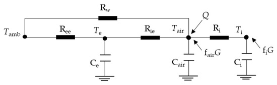 All the numerical values of the parameters (R and C) were deducted by the knowledge of the thermal and geometrical building features. Specifically, the first node (Te, Ce) represents the external building thermal mass, the second node (Tair, Cair) is the indoor air node, while the last node (Ti, Ci) is the internal building thermal mass. As suggested by EN ISO 13790 [36], Ce and Ci are calculated by summing the heat capacitances of all the building elements (up to the thermal insulation) in direct thermal contact with the internal air zone.