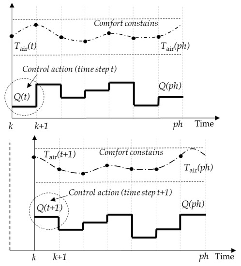 The LP optimization problem is solved at each time step within a MATLAB script, according to a “dual-simplex” algorithm. The actual air zone temperature, Tair(t), is passed to the MPC as the starting condition for the optimization. Based on the receding horizon principle, the control action at the controlled building time, t, is the first value of Qk in the optimal decision variable sequence. At the following time step, t+1, the optimization problem is re-solved, moving forward the dataset of the disturbances by a time step. Figure 3 shows the scheme of the operation.