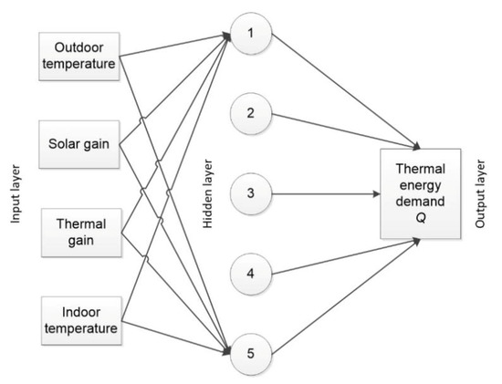 ANNs are available in different architectures, based on the physical–mathematical problem that is being studied. In the present work, since the goal was to estimate the thermal power required by a building, a fitting ANN was chosen. In MATLAB, fitting ANNs have a feedforward architecture and are trained according to a Levenberg–Marquardt backpropagation algorithm, which uses regression analysis and RMSE to evaluate the performance. As it is well-known that even one layer of neurons is sufficient to represent complex, nonlinear problems [37], in this study, one hidden layer with five neurons was used. The neurons used a hyperbolic tangent sigmoid as activation function. The ANN therefore had the architecture as represented in Figure 4.