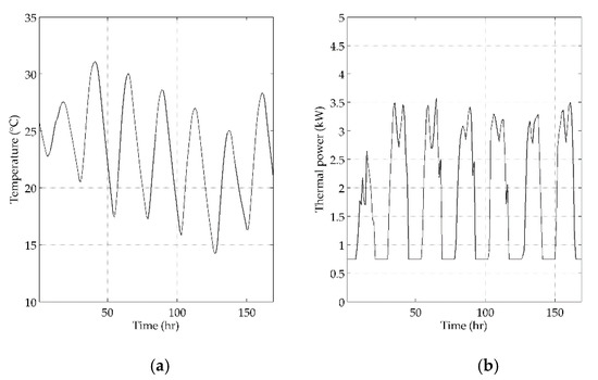 As discussed in Section 2, the evaluation of the forecast performance of the two building prediction models was realized according to two points of view: (i) the ability of the models to match the behavior of a known reference building and (ii) their dynamic operation when applied within the controller of the same building. Since short-term dynamics are involved in an MPC, a representative summer week was selected for the analysis (from July 30 to August 6). Figure 5 shows the uncontrollable inputs in the selected period (i.e., ambient temperature and total gains).