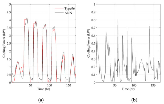 ANN model prediction results compared to training data: (a) cooling power demand; (b) root square error (RSE).
