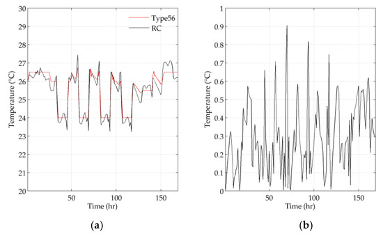 As concerns the performance analysis, the ANN training data were selected as comparison terms to test the two building models. As mentioned in Section 3, the ANN training data were obtained with daily random set-points, which could range in the allowed comfort band. Figure 6 and Figure 7 show the results in the entire 168-point dataset for the ANN-based model and the RC network, respectively. Since the output of the models was different in the two approaches, for the ANN the hourly cooling power forecasting was evaluated (Figure 6a), while for the RC network the internal air node temperature was considered (Figure 7a). As can be seen, both the prediction models were able to reply to the dynamic variations of the training data. In the first case, the RMSE was 0.26 kW, while the value found for the RC network was 0.34 °C. As highlighted by the RSE profile in Figure 6b, for the ANN the deviation was mainly due to the inability of the network to simulate the cases with reduced or zero cooling demand. For the physical-based model, instead (Figure 7b), there seemed to be a regular prediction error rather than specific peaks. It is worth noting that the RSE assumes a maximum value of 0.9 °C in the RC model and a value of 0.8 kW in the ANN model.