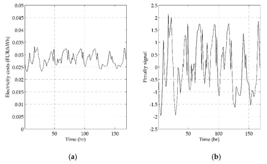 Electricity cost signal for the selected summer week: (a) hourly energy cost, c; (b): penalty signal, p.