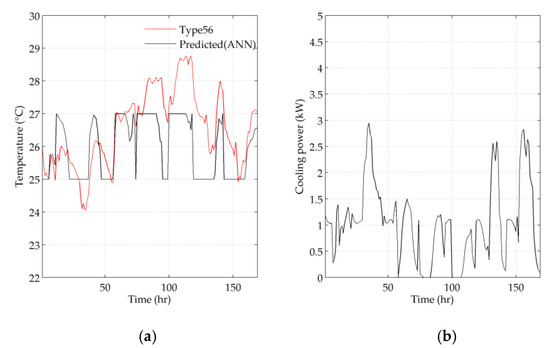 MPC with ANN as building prediction model: (a) internal air temperature, comparison between the actual Type 56 air zone temperature and ANN prediction at each timestep; (b) cooling power profile (control action sequences).
