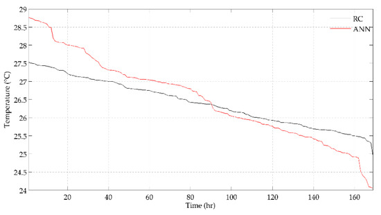 Although the models seem to have similar performances, different on-time trends for the two models can be expected if the actual building air temperature is observed (the red curves in Figure 9a and Figure 10a). In particular, the MPC with the RC network seemed to follow the system dynamics more accurately than the controller with the ANN. When the ANN was operatively used in the controller, it appeared to perform less effectively than the RC network. In both cases, in the second half of the tested period, the prediction error started to grow but, in the case of the ANN, the actual air zone temperature exceeded the upper comfort limit by more than one degree (28.8 °C was the maximum value reached with the ANN in the controller, against 27.5 °C in the case of the RC model). This behavior is also confirmed by the duration curves reported in Figure 11. In the building regulated by the ANN-based MPC, the indoor temperature was found to be above the upper control limit for 36% of the simulation time. This percentage dropped to 24% when the RC network was used. This behavior was due to the difficulty of the control to maintain the comfort level when the temperature was too close to the upper comfort boundary; a small error in prediction can also cause temperature violations.