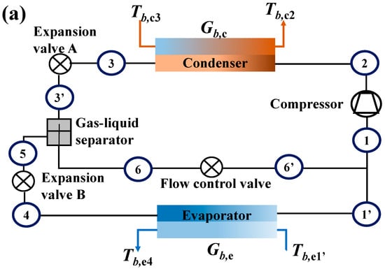 The refrigerant vapor separated by the gas–liquid separator was injected into the suction line of the compressor through a mass control valve. According to the specification of the gas–liquid separator, the refrigerant injection ratio R could be calculated from the outlet refrigerant state of the expansion valve A and the total refrigerant mass flow rate, and it is typically defined using Equation (9):