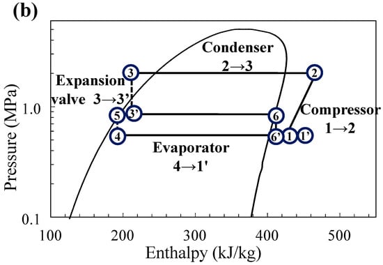The energy consumed in the building sector is about 20% of the world’s delivered energy consumption, and it increased by 1.3% per year from 2018 to 2050 [1]. Meanwhile, about half of the total building energy consumption is used for space heating and hot water supply [2]. Heat pumps are mechanical devices to transfer heat energy from a lower to higher temperature level mainly for space and hot water supply, which mainly includes a mechanical vapor compression cycle, an absorption cycle and an adsorption cycle [3]. The heat-operated absorption and adsorption cycles are suitable for application in a place where inexpensive heat source or waste heat is available because the compressor is not needed in these heat pump cycles. However, their achievable coefficient of performance (COPs) are lower than that of the mechanical vapor compression heat pump cycle, which is widely used nowadays [4]. Therefore, a vapor compression heat pump system has high efficiency and is considered to be competitive to decrease energy consumption and thus reduce CO2 emission [5,6]. Continuous efforts with regard to research on more efficient systems have mainly focused on viewpoints using alterative cycles [7,8,9,10] and the use of new refrigerants [7,11].