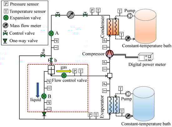 The schematic of the experimental setup is illustrated in Figure 2, and the picture of this device is shown in Figure 3. It can be seen from Figure 2 that the experimental prototype can be divided into the heat pump evaluation fluid cycle and the refrigerant cycle. In terms of the heat pump evaluation fluid cycle, the user-defined flow rates and temperatures of the primary and secondary fluids can be provided by the heat pump evaluation system developed by our research group. There are two storage tanks in this heat pump evaluation system, one is filled with ethylene glycol solution (freezing temperature of −15 °C) to simulate the sink of the primary fluid, and the other one is filled with propylene glycol (boiling temperature of 187.4 °C) to simulate the heating load of the secondary fluid. The temperatures and flow rates of the primary and secondary fluids could be regulated by corresponding proportional–integral–derivative (PID) controllers.